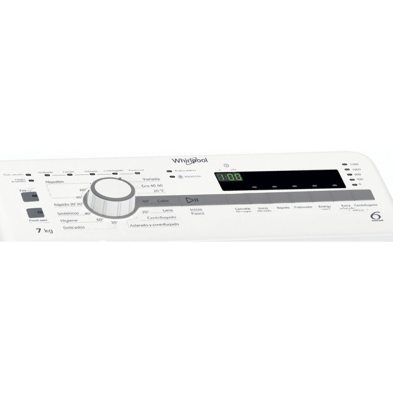 Whirlpool TDLR 7220SS SP/N. Tipo de carga: Carga superior. Capacidad nominal: 7 kg, Clase de secado por giro: C, Nivel de ruido (spin): 78 dB, Máxima velocidad de centrifugado: 1200 RPM. Color del producto: Blanco. Ancho: 400 mm, Profundidad: 600 mm, Altura: 900 mm. Clase de eficiencia de energía: E