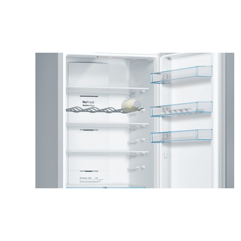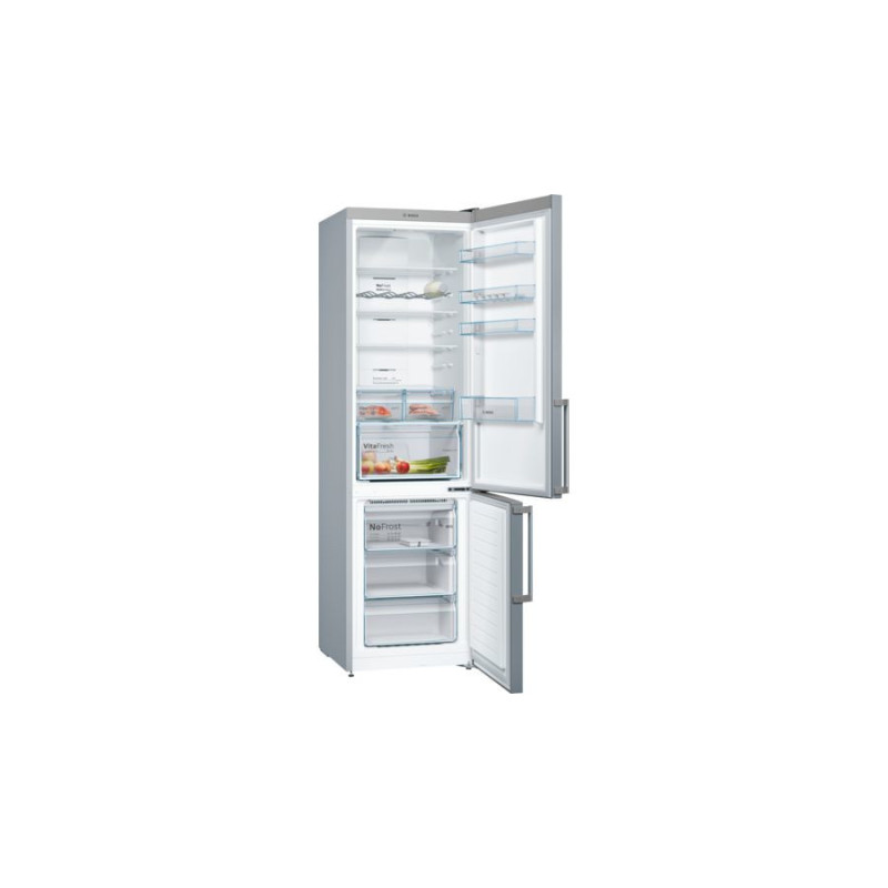 Bosch Serie 4 KGN39XIDP. Capacidad neta total: 368 L. Bisagra para puerta: Derecho, Tipo de visualizador: LED. Clase climática: SN-T, Nivel de ruido: 36 dB. Frigorífico, capacidad neta: 279 L, Antiescarcha (nevera), Sistema multi-flujo de aire (nevera), Luz interior de la nevera. Congelador, capacidad neta: 89 L, Capacidad de congelación: 14 kg/24h, Antiescarcha (congelador). Compartimiento de zona fresca. Clase de eficiencia de energía: D, Consumo de energía anual: 191 kWh