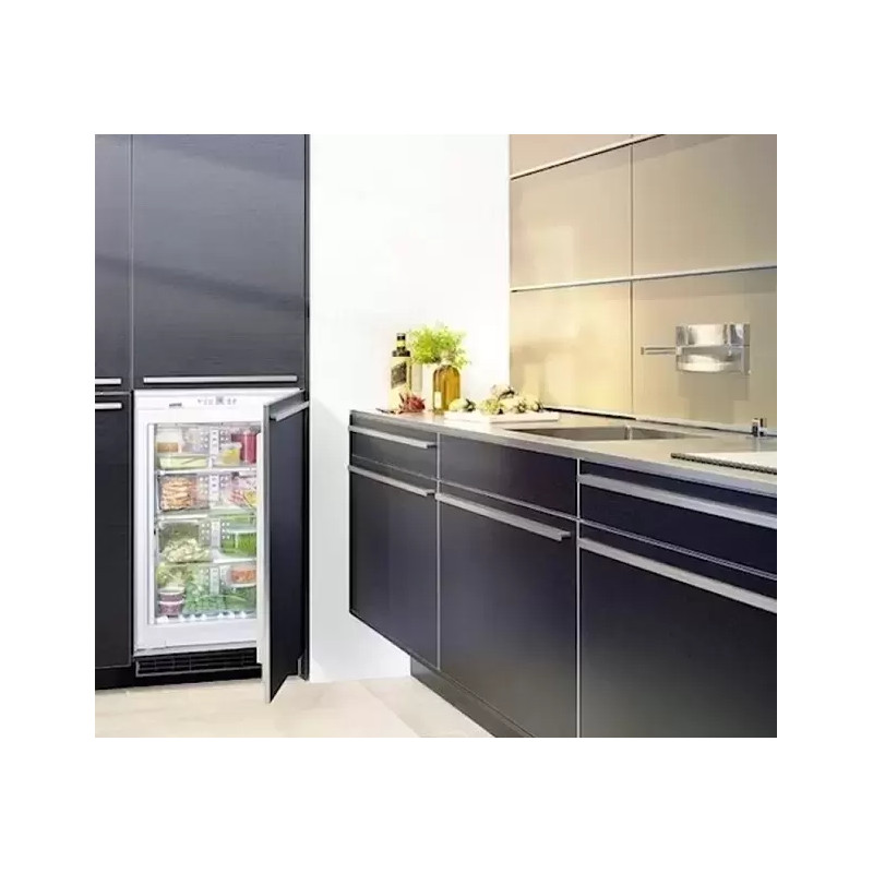 La unidad cabe en un nicho de armario y se puede colgar un panel decorativo en la parte frontal, lo que permite que el congelador Liebherr IGN 1654 se integre en cualquier decoración.